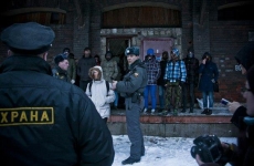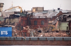 Строители пытаются снести пакгауз XIX века, входящий в комплекс зданий Варшавского вокзала. Днем группа градозащитников заперлась внутри пакгауза, протестуя против незаконного сноса исторической постройки.