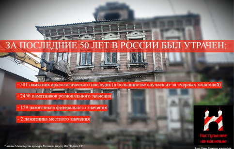За последние 50 лет в России было утрачено 3118 объектов культурного наследия, среди них памятники федерального, регионального, местного и археологического наследия.