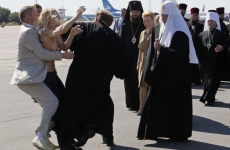 Девушка из FEMEN, написав на спине «Kill Kirill», голая отправилась в аэропорт Киева встречать патриарха Московского и всея Руси Кирилла.