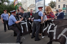 Около десяти активистов "Другой России вышли на еженедельный пикет, согласованный с мэрией Москвы,  с традиционным баннером "Россия без Путина" неподалеку от станции метро "Новокузнецкая".
